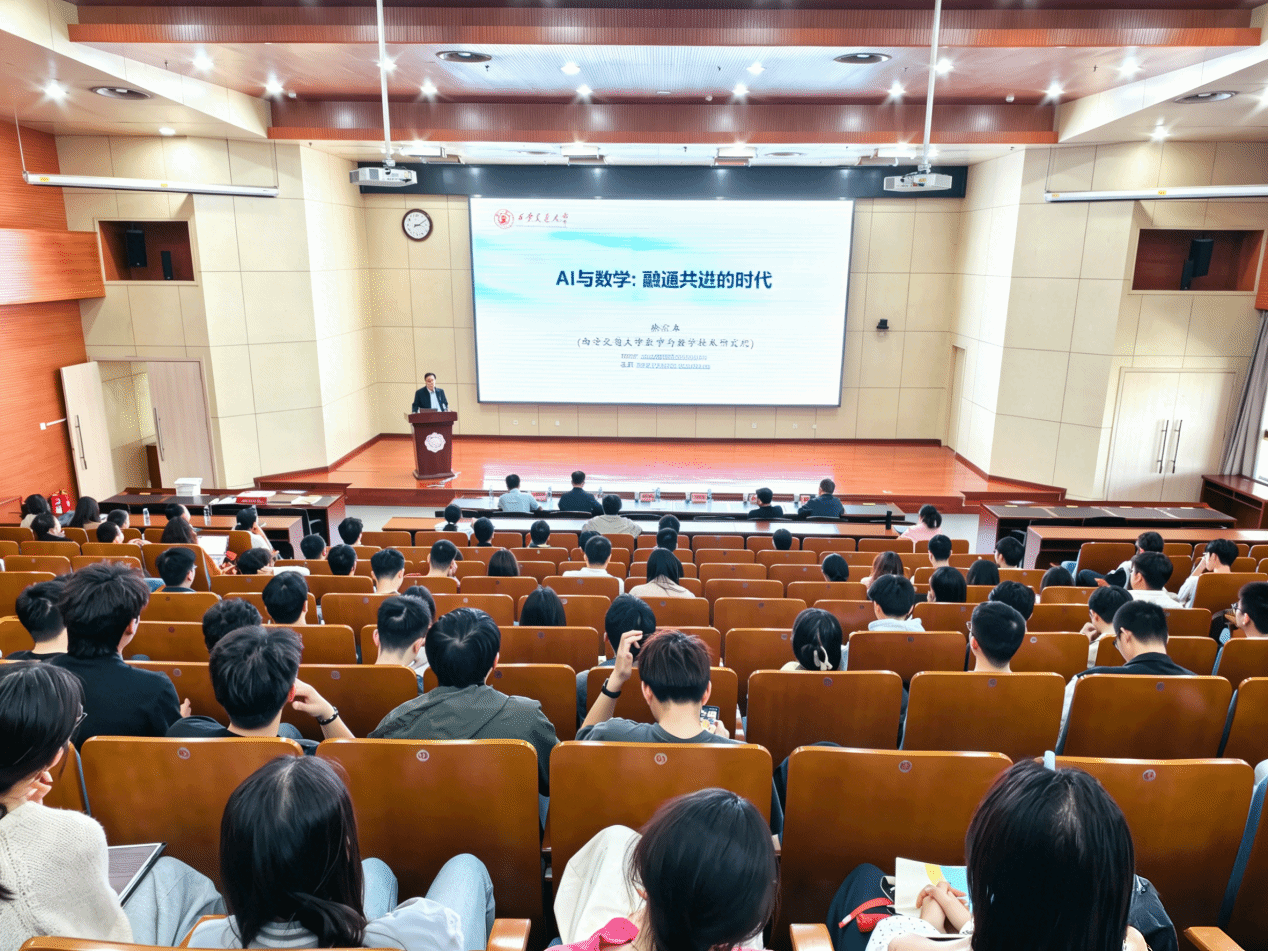 徐宗本院士以“AI与数学:融通共进的时代”为题,围绕三个方面的内容展开系统阐述。徐宗本院士以人工智能及其发展切入,深入浅出地讲解了大模型的运行结构和机制,系统梳理了当前人工智能研究亟待解决的若干个基本数学问题,指出数学不仅为AI提供模型、算法与正确性依据,更提供AI可能性的指示与预判,发展新的数学理论去解决AI基础问题将成为应用数学的重要方向。最后,徐宗本院士指出,AI正为数学上不易解决的问题带来新的解决途径甚至突破,科学研究的数据驱动与模型驱动方法并非对立,而是相辅相成,共同构成当今科学研究的新范式。整场报告高屋建瓴、深入浅出,赢得了现场师生阵阵热烈的掌声。